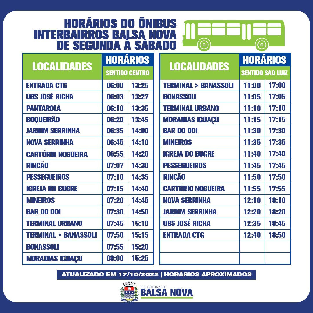 HORÁRIOS DO ÔNIBUS INTERBAIRROS BALSA NOVA
