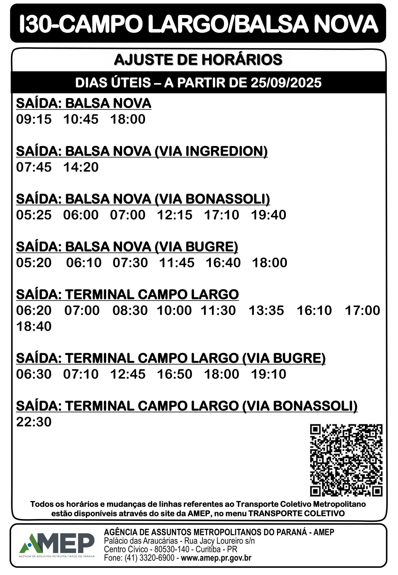 HORÁRIOS DA LINHA I30 CAMPO LARGO/BALSA NOVA