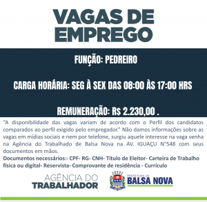 “A disponibilidade das vagas variam de acordo com o Perfil dos candidatos comparados ao perfil exigido pelo empregador.” Não demos informações sobre as vagas em mídias sociais e nem por telefone, surgiu aquele interesse na vaga venha na Agência do Trabalhado de Balsa Nova na AV. IGUAÇU N°548 com seus documentos em mãos.