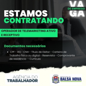 “A disponibilidade das vagas variam de acordo com o Perfil dos candidatos comparados ao perfil exigido pelo empregador.” Não fornecemos informações sobre as vagas em mídias sociais e nem por telefone, surgiu aquele interesse na vaga venha na Agência do Trabalhado de Balsa Nova na AV. BRASIL N°665 com seus documentos em mãos.