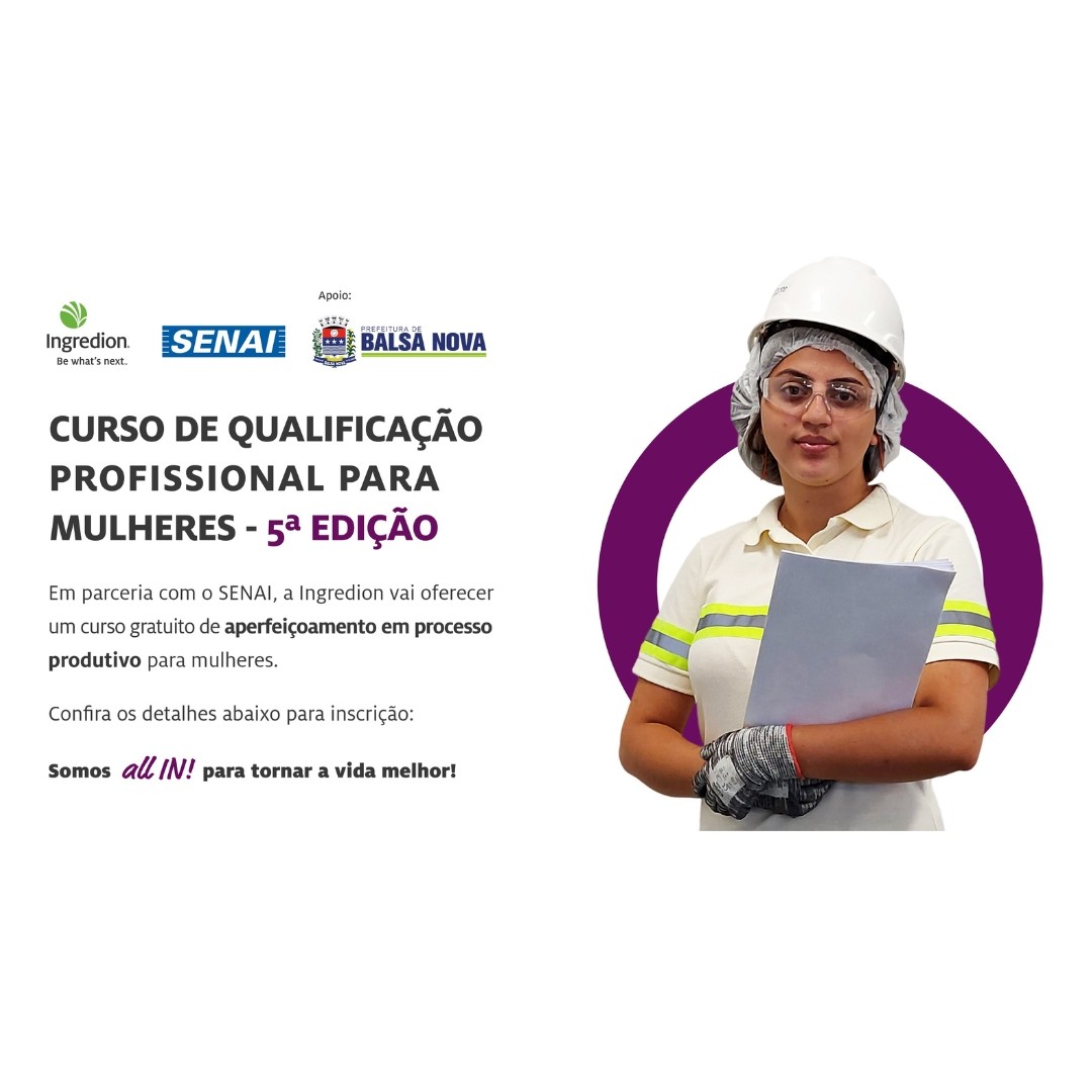 A Ingredion Balsa Nova está com inscrições abertas para a 5 ª edição do curso *A indústria também é Delas*, programa realizado em parceria com o SENAI, que oferece qualificação gratuita para mulheres, a fim de proporcionar conhecimento técnico para que elas possam desenvolver uma carreira na indústria.