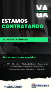 “A disponibilidade das vagas variam de acordo com o Perfil dos candidatos comparados ao perfil exigido pelo empregador.” Não fornecemos informações sobre as vagas em mídias sociais e nem por telefone, surgiu aquele interesse na vaga venha na Agência do Trabalhado de Balsa Nova na AV. BRASIL N°665 com seus documentos em mãos.
