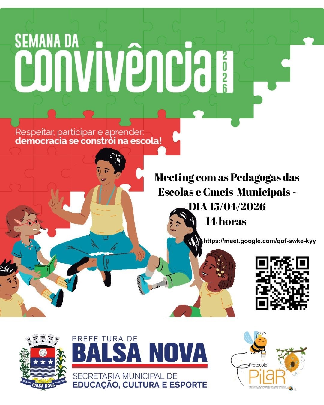 A Secretaria Municipal de Educação de Balsa Nova, por meio da Equipe Pilar, reafirma seu compromisso com a promoção de ambientes escolares seguros, acolhedores e inclusivos ao aderir e participar ativamente da Semana Nacional da Convivência Escolar 2026, iniciativa do Ministério da Educação (MEC).