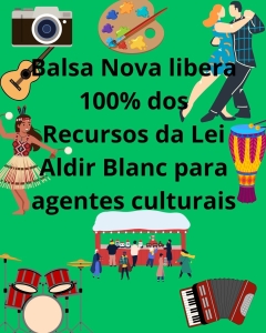 A Prefeitura de Balsa Nova, por meio da Secretaria Municipal de Educação, Cultura e Esporte, anuncia a liberação de 100% dos Recursos da Lei Aldir Blanc apenas para agentes culturais do município. Com isso, artistas, grupos, produtores e fazedores de cultura contemplados no edital passam a receber integralmente o valor aprovado para o desenvolvimento de seus projetos.